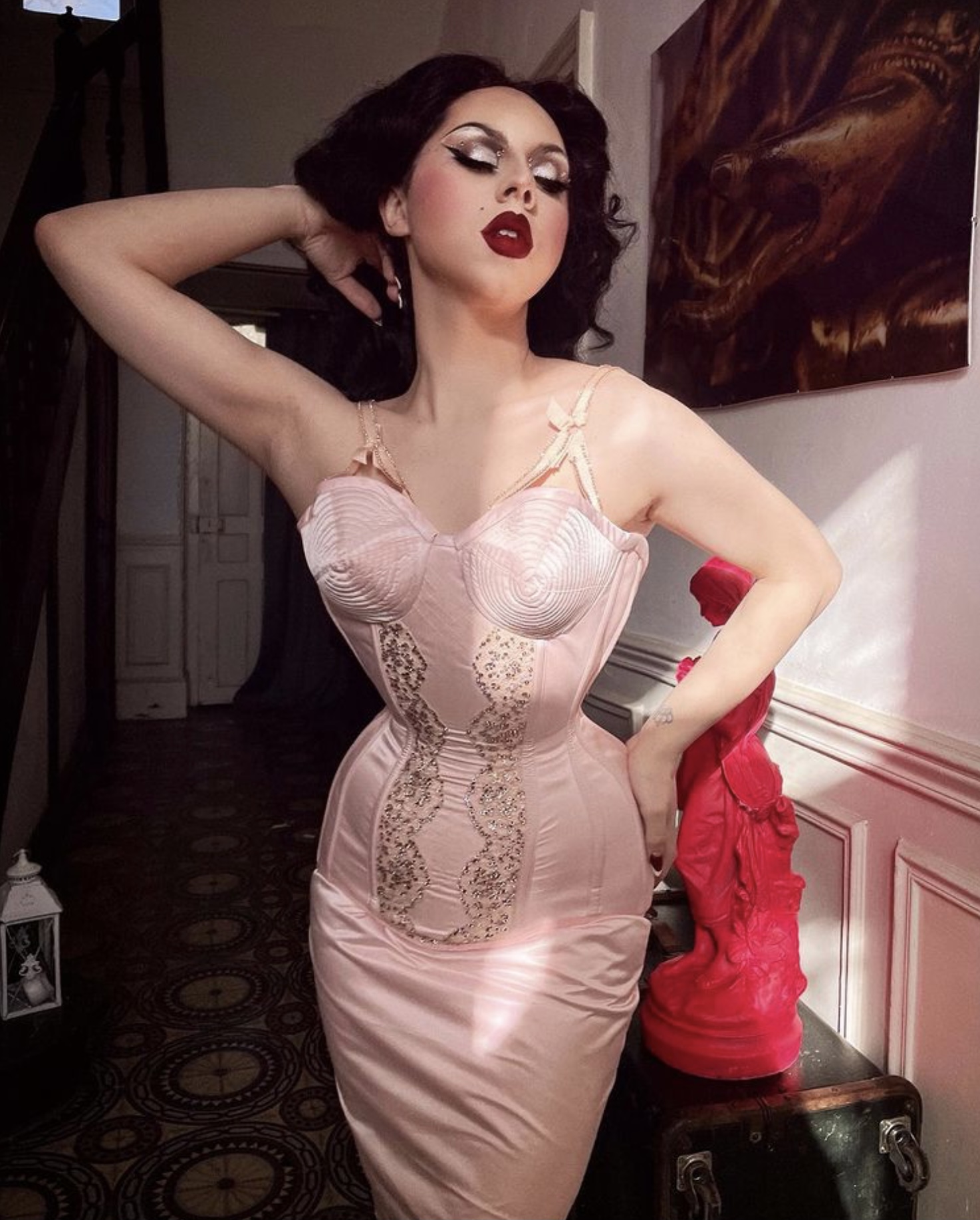 le modèle dolly page mesure 1,68 m et porte le corset avec un tour de taille de 55cm.
