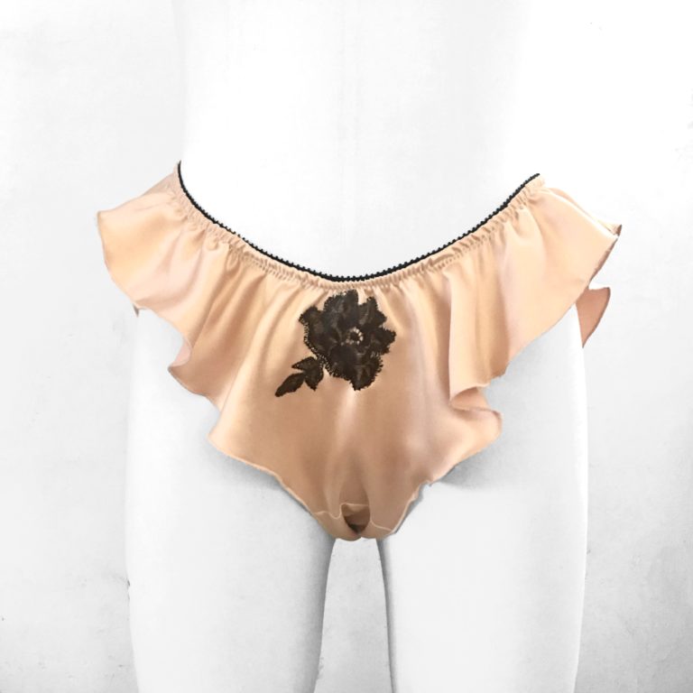 Cette culotte a la coupe brésilienne sort tout droit de mon amour pour les années 80. Elle est décoré d’une incrustation en dentelle de Calais sur le devant et d’un jolis nœud en satin de coton orné d’un strass cousu avec amour par mes petites mains.